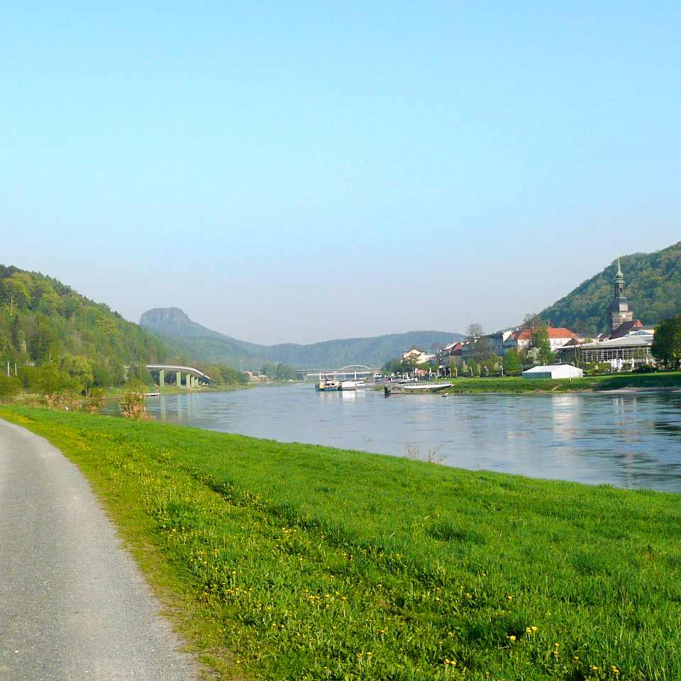 Před obcí Königstein, kde se Labe pěkně kroutí, lze pěkně vidět stejnojmennou pevnost, kterou jsem navštívil druhý den mého pobytu v Českosaském Švýcarsku.Z levé strany řeky, lze na protější straně, pěkně vidět skalní útvar Bastei, který jsem navštívil na zpáteční cestě.